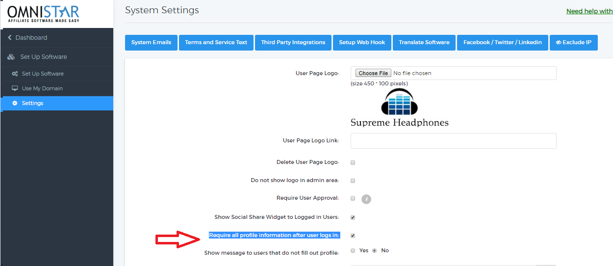 If this option is selected, when people login to their Stripe Referral Program user area for the first time, it will prompt them to complete their profile fields before they can see their Stripe Referral Program dashboard. You can try this and show screen shots of admin area and also the user area or what they will see when the go to login and see they have to update profile first.